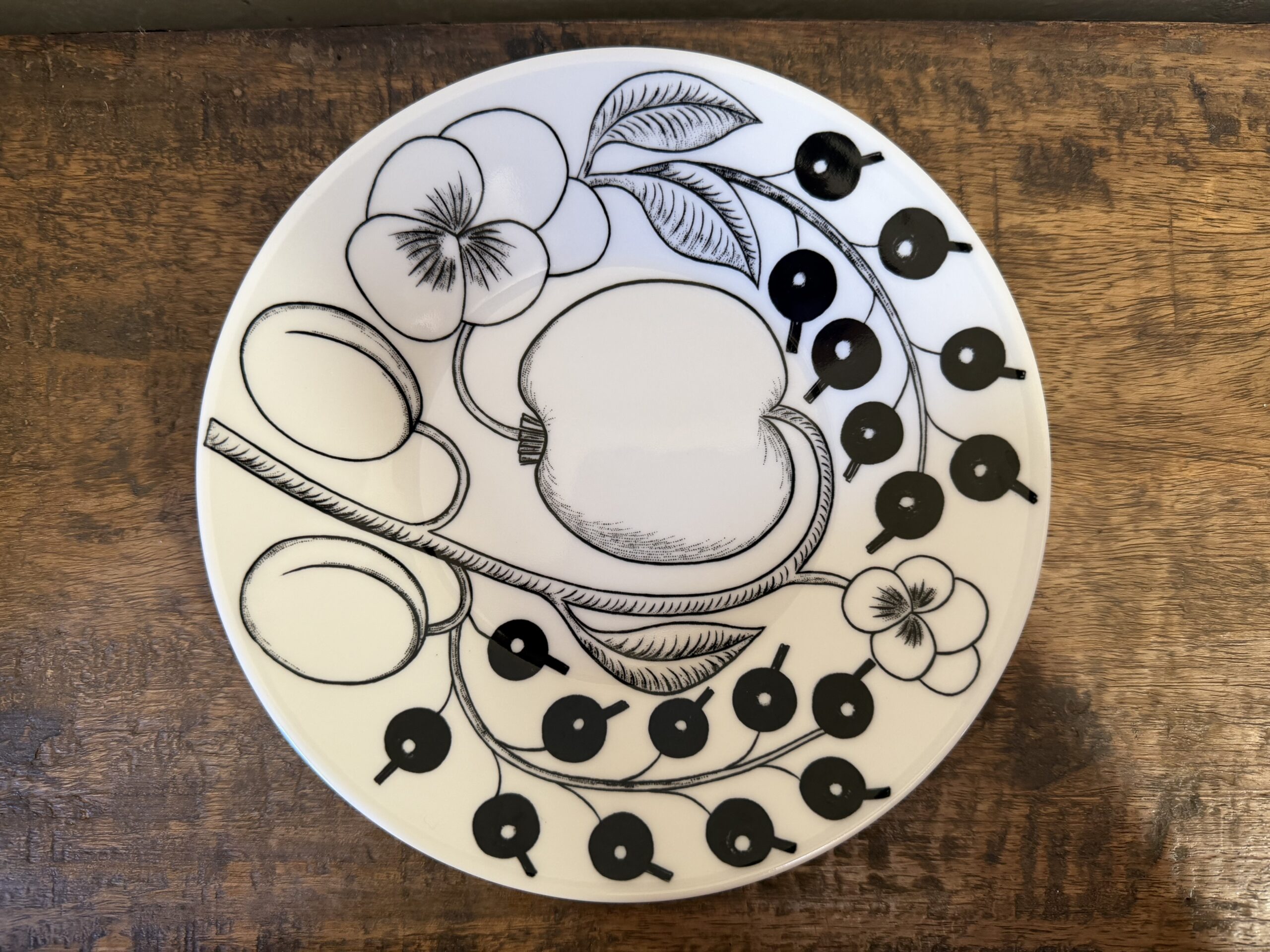 アラビアのブラックパラティッシは、同じシリーズの中でも特に印象の強い存在として語られることが多い。果実や植物を大胆に描いたモチーフは共通しているものの、配色が変わることで器全体の空気感は大きく異なる。ブラックを基調としたパラティッシは、華やかさよりも奥行きや落ち着きを感じさせ、使う人の感覚に静かに訴えかけてくる。
